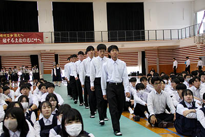 応援の生徒たちが拍手で待ち受けるなか、県内最大数の約280名の選手団が元気に行進し、講堂に入場しました。