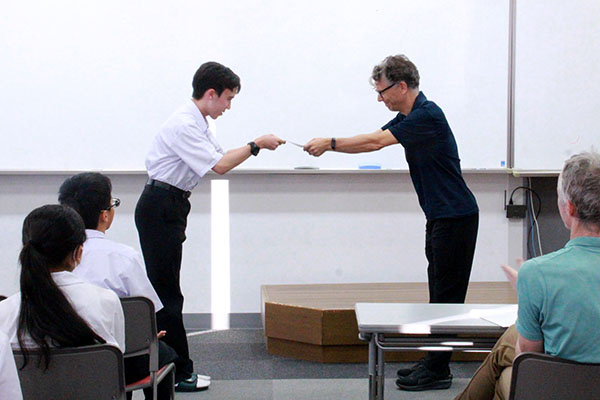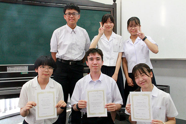 9月26日放課後、筆山ホールで中学校英語暗唱大会が行われました。中学生はそれぞれの学年で決められた英文を暗唱し、クラス選考を突破した代表者がその出来栄えを競い合います。 この大会では英文をしっかり暗記することは勿論のこと、その内容を抑揚や感情を込めて聴衆に伝えます。英語を自分の言葉として堂々と発表する態度に、応援に駆けつけたクラスメイトや担任の先生方は引き込まれていました。 今年の結果は次のようになりました。中1優勝:津田さん、準優勝:高木さん。中2優勝:吉田さん、準優勝:藤田さん。中3優勝:ウォルシュさん、準優勝:長山さん。校長特別賞:中3篠森さん。おめでとうございます。 |