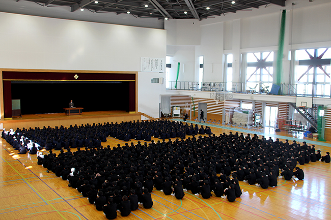 12月16日(火)、期末考査・大掃除終了後、第二学期の終業式が行われました。 続いて、沖生徒部長は、「期末考査お疲れ様でした。今年度、学校アンケートに登校時間を調査する項目を入れました。始業近くに登校する生徒の割合から計算すると、どれだけ多くの土佐校生の通行が近所の方々に迷惑をかけているかが想像できます。登校時間に気を付けてください。服装についても二学期何度も注意をしました。生徒必携で確認をしておきます。最後に『優しさ』について。優しい人とはどんな人か。人の気持ちがわかることは大切だと思いますが、イコール優しいではないと思います。ネットの世界には人の気持ちがよくわかるからこそ、それを利用して相手を傷つける人がいます。優しさとは、相手の気持ちを考え、さらに相手のためになる行動をすることです。優しさには多くの要素がありますが、まず身近な人に優しくしてください。明日からの冬休みが始まりますが、自分が楽しいだけでなく誰かのためになる優しい生活をしてください。また三学期に会いましょう、よいお年を」と挨拶しました。 最後に、山田進路部長は、「高1生は将来を見据えた文理選択を考えてください。将来に関する本は読みましたか。大学のHPは見ましたか。模試は受けましたか。高2生は、学習習慣を身につけてください。苦手な科目に取り組みましたか。大学の学部学科情報を仕入れましたか。スマホを管理できていますか。高1・2生は今の授業を大切にしないと高3で必ず伸び悩みます。とにかく自学自習で基礎力を身につけられるよう自分で学ぶことを心がけましょう。今の貴重な時間を大切に過ごしてください。高3生にはまた後ほど、集会でお話しします」と述べました。 12月17日より高3生は冬季補習、高2生以下は冬休みとなります。 終業式後には、冬休み中に全国大会に出場する部活動の壮行式が行われました。弓道部・自転車競技部・棋道部・英語研究部から各選手の紹介があった後、出場生選手を代表して、自転車競技部の西森優豊さんから挨拶がありました。生徒たちは激励で選手団にエールを送っていました。 式終了後、高3生は大階段で集合写真を撮りました。 |