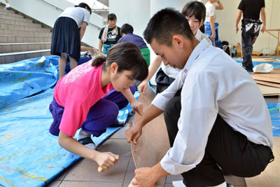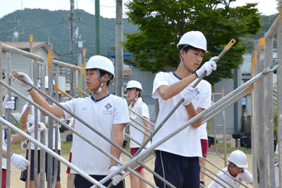 予行後、高3生はヤグラの組み立て作業を行いました。