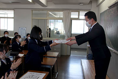 小村校長は式辞の中で、「学年通信のタイトル『Brilliant Mistakes』にこめられた願い通り学校生活の中での様々な失敗を糧に3年間で大きく成長してくれた。」と述べました。また「知ることは越えることでもある。自らを制約しているものを知ることで、その制約を越え輝く人物に成長してほしい。」と激励しました。