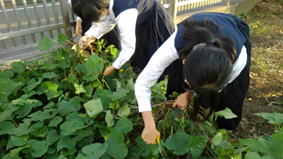 | 初夏に植えた紅あずま。植えたばかりの苗は、今にも枯れてしまいそうな風を見せていましたが、1週間もすると、葉柄がしっかりとして、葉を太陽に向けるだけの力をつけました。猛暑の夏、水まきをしない方がいいと知り、見守る日々。過酷な季節も、どんどん茎をのばし、葉を茂らせて、「土佐校農園」の一角では、サツマイモの存在感が強くなっていきました。