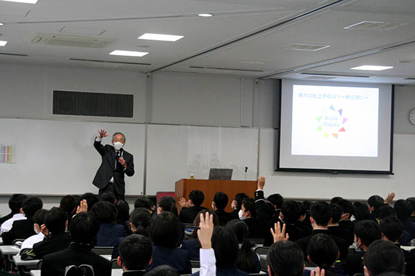 14日(金)、6時間目の総合では、小村前校長をお呼びして、土佐の歴史についてや、これからどのような土佐校生になって欲しいか、などのお話をしていただきました。
