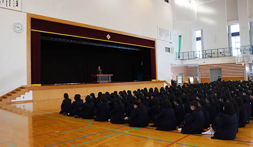 M田校長は、年始の挨拶に加え、元日に能登半島で起きた大地震に心を寄せながら、さらなる防災意識を喚起しました。その後は部活動等の活躍にもふれ、冬休み中の生徒たちの頑張りを称えました。大学入試を直前に控えた高3生に向けては「共通テストまであと4日。力を最大限に発揮し、目標を達成できることを祈っています」と期待をもって激励し、高2・高1生には「進学に向け、自発的に行動できる土佐高生であってください」と述べました。 続いて沖生徒部長も能登半島の地震や羽田空港での飛行機事故に触れた後、本校卒業生の多方面での活躍を紹介しました。「今ここにいるみんなは無限の可能性があります。キラキラした十代という今、思い通りにならないことがあっても自分のいる場所を受け入れて歩んでください」と話しました。 藤岡進路部長は自身が出かけた初詣でのエピソードを紹介しながら「自分だけの価値観ではなく、多様な価値観を受け入れなければいけませんね」と述べていました。 |