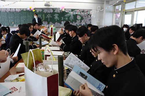 続いて、傍士理事長、利岡振興会会長、西山同窓会会長も祝辞をいただいた後、在校生代表として高校2年・青木優果さんが送辞を述べました。答えて卒業生代表・藤本佳子さんは「絶えずコロナの影響を受けた高校生活でしたが、徐々に緩和され様々な行事で久しぶりに一体感を得られました。不安定で厳しい社会の中、私たちはこれからも答えのない問いに立ち向かっていかなければなりませんが、柔軟な思考力と他者との助け合いの心を忘れず向かっていきます。常に自己研鑽を忘れず、社会に貢献していける人物になることを誓います」と希望あふれる答辞を述べてくれました。