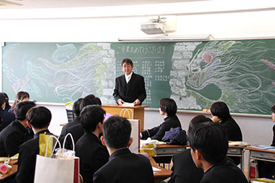 M田校長は、「3年間の高校生活は楽しくもあり苦しくもある日々だったと思います。そんな毎日を乗り越え、今日卒業を迎えられた皆さんに心から敬意を表します。コロナの規制が緩和され各方面で通常が戻りました。99回生はコロナ前を知らない中、柔軟で立派なリーダーシップを発揮してくれたと思います。さぁ、皆さんがこれから進む道は不確実なものです。何度も人生の岐路に立たされ選択を迫られますが、決断するのは自分自身です。心身の健康を大事にしながら学びを続け、多様な視点でどう生きどう社会に貢献するかを考えていってください」とはなむけの言葉を贈りました。