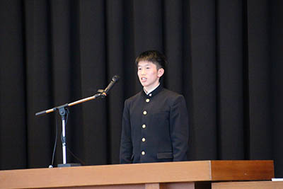 最後に、沖生徒部長から、「自転車盗難防止モデル校の活動を通じて、様々な活動をしてきました。学校のある潮江地区に認められるようにと続けてきた活動を、今後も継続していきたいと考えています。1学期に述べた『命』の話を覚えているでしょうか。限りのある命ですが、今の皆さんは自分のために使う時間のほうが多いと思います。自身の見えないところで自分のために使われている時間があることを、想像できるようになってください。もちろん自身を高めるためにどんどん時間を使ってください。でも、この春休みという機会、誰かのためにも時間を使ってみてほしいと思います」と述べました。