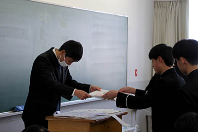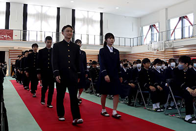 M田校長は、「まずは卒業式を挙行できる環境に感謝したい。この3年間は、学問・礼節・スポーツを柱に、報恩感謝のもと様々なことによく取り組んできた。苦しいことや辛いことも多かったと思うが、文武両道を名実ともに高めたことに敬意を表す。これからは、自ら進んで決めるという重みを理解しながら生活していかなければならない。自発的であること、文武両道を続けること、自由のために規律を守ることを大切に進んでいってほしい」と、式辞を述べました。