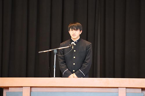 その後、沖生徒部長から、「3学期の始業式で、『挨拶は自分から』とお話をしましたが、少しずつそういう生徒が増えているように感じています。2月に『生徒心得・生徒服装規定』を改訂しました。今の土佐の生徒のあるべき姿を考えた改訂です。配付されたものを熟読してください。校則はなぜあるのか。私は、社会規範を学ぶためのものだと思っています。また、校則は生徒へのメッセージだと考えます。土佐を守るために、土佐独自のルールがあります。土佐を守るということは、土佐の生徒を守ることです。何かを変えたいなら、今あるルールをよく守り、信頼される集団であることが大切だと考えています。この変更を機に、各自が色々と考えてみてください」と挨拶しました。