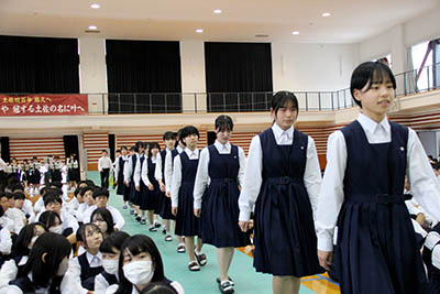 応援の生徒たちが拍手で待ち受けるなか、県内最大数の約280名の選手団が元気に行進し、講堂に入場しました。