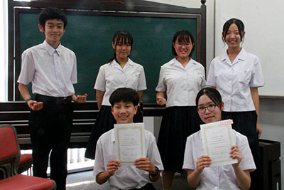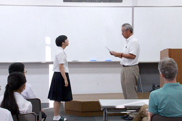 9月26日放課後、筆山ホールで中学校英語暗唱大会が行われました。中学生はそれぞれの学年で決められた英文を暗唱し、クラス選考を突破した代表者がその出来栄えを競い合います。 この大会では英文をしっかり暗記することは勿論のこと、その内容を抑揚や感情を込めて聴衆に伝えます。英語を自分の言葉として堂々と発表する態度に、応援に駆けつけたクラスメイトや担任の先生方は引き込まれていました。 今年の結果は次のようになりました。中1優勝:津田さん、準優勝:高木さん。中2優勝:吉田さん、準優勝:藤田さん。中3優勝:ウォルシュさん、準優勝:長山さん。校長特別賞:中3篠森さん。おめでとうございます。 |