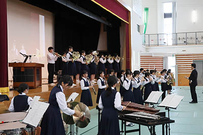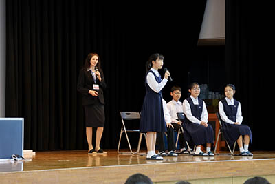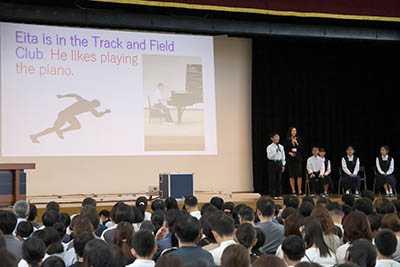 全体会の前後には、校舎案内も行われ、多数の方々に校舎を見学していただきました 。そして吹奏楽部による歓迎演奏の後、放送部の司会で全体会が始まりました。学校長の挨拶、中央委員会会長の橋本さんの挨拶に続き、全体や各教科などの入試説明がありました。さらに中1の代表生徒たちによるOC(英会話)のプレゼンテーションも行われました。