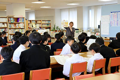 図書室では手島先生から図書室の使い方についての説明がありました。中1生は皆真剣な様子でそれぞれの先生のお話に聞き入っていました。